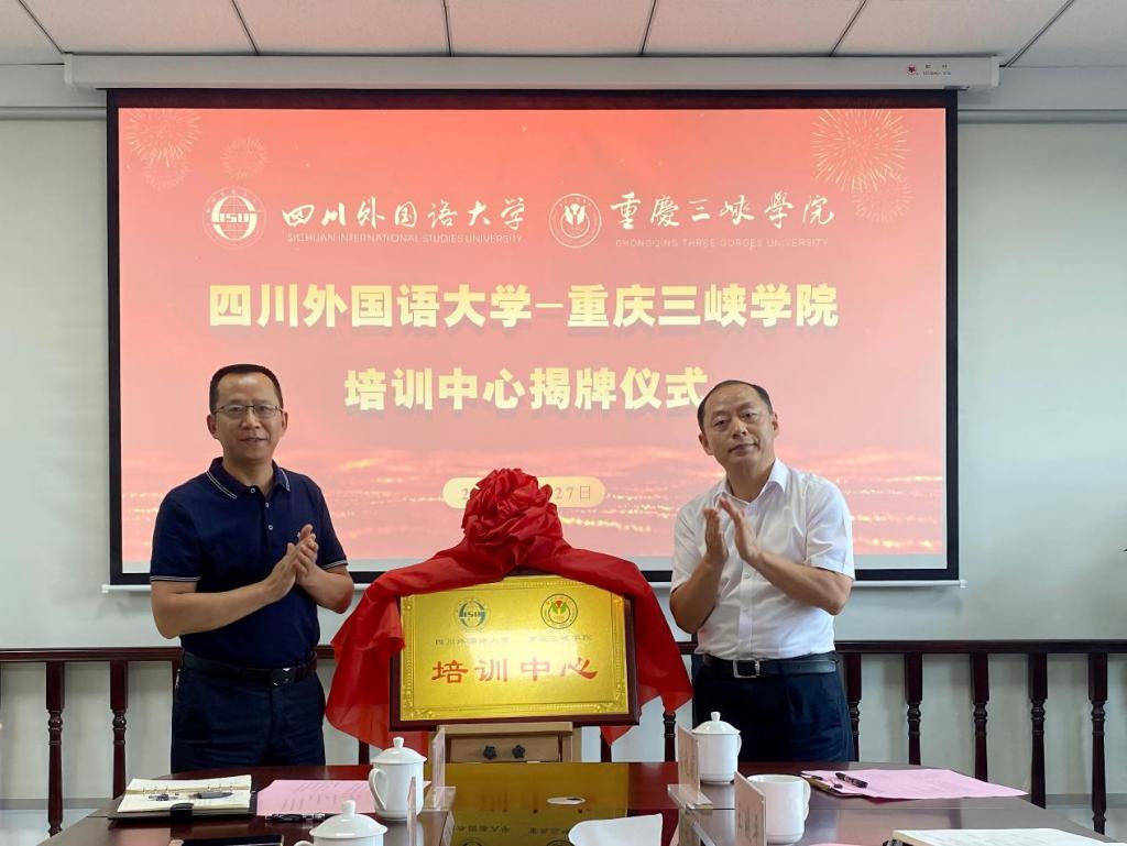 9月27日上午,我校与四川外国语大学合作共建的“四川外国语大学-太阳成集团tyc33455培训中心”揭牌仪式在我校顺利举行。四川外国语大学党委常委、副校长张北坪,网络与继续教育学院院长黄进财以及相关部门负责人与教师代表,太阳成集团tyc33455党委常委、副校长郭作飞,继续教育学院党总支书记陈建、院长郭远臣以及学院相关科室负责人出席了揭牌仪式。
