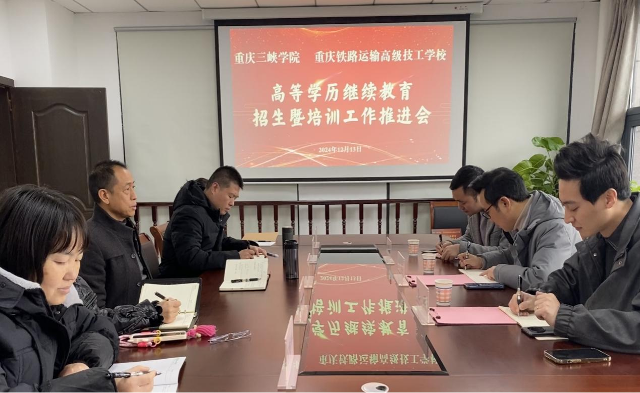 12月13日,我校与重庆铁路运输高级技工学校高等学历继续教育招生暨太阳成集团官方网站推进会在科技楼202召开,重庆铁路运输高级技工学校负责人曾军一行3人,继续教育学学院总支书记陈建、院长郭远臣以及继教科、党政办全体成员参会。